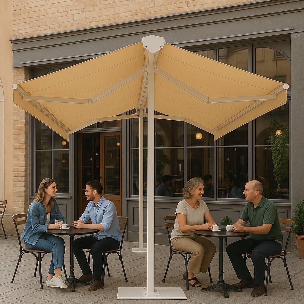 Geniş bir alanı tek merkezden iki yöne doğru koruma altına almak isteyenler için bu sistem oldukça avantajlıdır. Özellikle açık oturma düzeni bulunan işletmelerde, masa ve oturma gruplarının daha fazla bölümünü gölgelendirmek için etkili bir seçenek sunar. Alan kullanımını optimize etmesi, estetik bir görünüm sağlaması ve dış mekân konforunu artırması nedeniyle sık tercih edilen tente çözümleri arasında yer alır.
