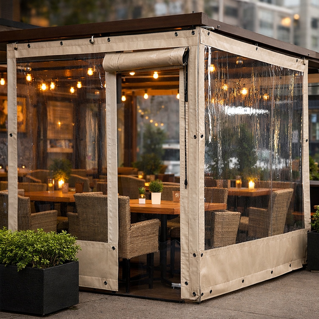 Dış mekan cafe kapatma brandası tentesi, işletmelerin açık alanlarını daha işlevsel kılmak için kullanılan,